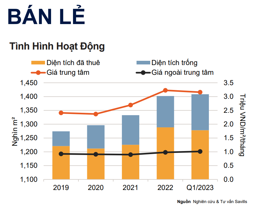 Dù hoạt động thị trường trầm lắng với công suất thuê giảm nhẹ đi 1% so với quý trước, nguồn cung lại tăng 1% theo quý và 4% theo năm. Trung tâm mua sắm duy trì tỷ trọng nguồn cung lớn nhất với 962.400m² (56%); tuy nhiên, tốc độ tăng trưởng của khối đế bán lẻ đã vượt xa các trung tâm mua sắm kể từ năm 2019. Phân khúc này chiếm 15% thị phần.