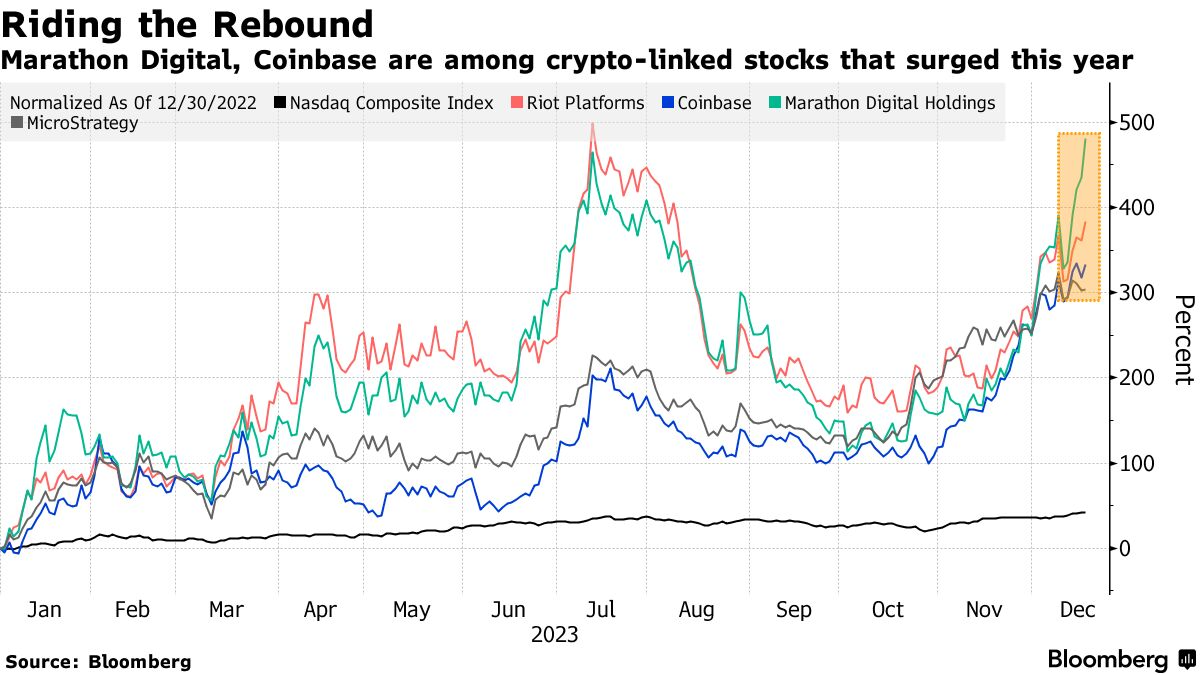 Các công ty khai thác bitcoin như Marathon Digital Holdings và Riot Platforms, sàn giao dịch hàng đầu của Hoa Kỳ Coinbase Global và công ty chuyển đổi thành nhà đầu tư bitcoin MicroStrategy đều tăng trưởng mạnh. Coinbase thậm chí tăng gần 400% dù đang vướng kiện tụng với Ủy ban Chứng khoán và Giao dịch Hoa Kỳ (SEC) liên quan đến cáo buộc vận hành nền tảng chưa đăng ký.
