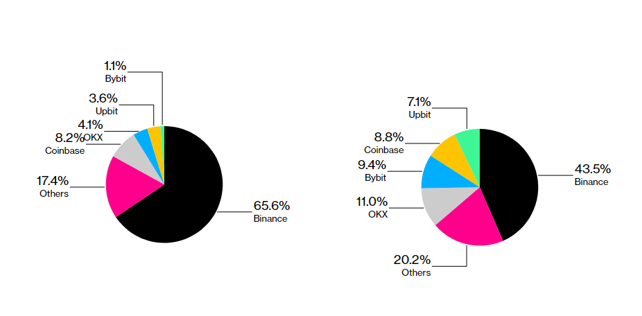 Thị phần sàn giao dịch tiền điện tử vào đầu năm 2023 với Binance chiếm hơn 65% khối lượng giao ngay (trái) và đến giữa tháng 12, các nền tảng bao gồm Upbit, Bybit và OKX tăng giá khi cổ phiếu của Binance giảm. Ảnh minh họa: Bloomberg