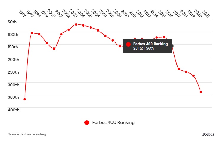 Từ năm 1997 đến năm 2016, Donald Trump luôn nằm top 200 danh sách 400 tỷ phú giàu nhất Hoa Kỳ do Forbes xếp hạng. Nhưng mọi thứ trở nên tồi tệ hơn vào năm ông đắc cử tổng thống. Sau 5 năm tụt hạng, tính đến nay ông đã có hai lần hoàn toàn bị loại khỏi danh sách.