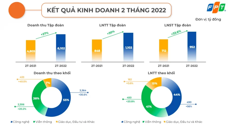 FPT vừa công bố kết quả kinh doanh ước tính trong hai tháng đầu năm 2022. Trong đó lợi nhuận trước thuế quốc nội tăng lên tới 56% so với cùng kỳ và đóng góp khoảng 44% vào cơ cấu lợi nhuận.